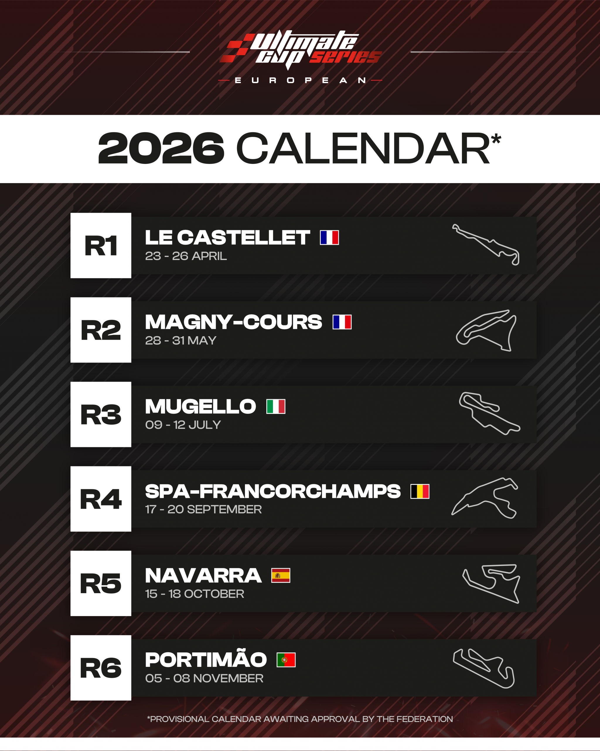 L’Ultimate Cup European Series présente les six meetings qui composeront la saison 2026. Cinq circuits, vecteurs de courses spectaculaires, déjà présents en 2025 seront de nouveau au rendez-vous. La grande nouveauté se trouvera en Belgique avec l’apparition de Spa-Francorchamps, pour la première fois de l’histoire du championnat.